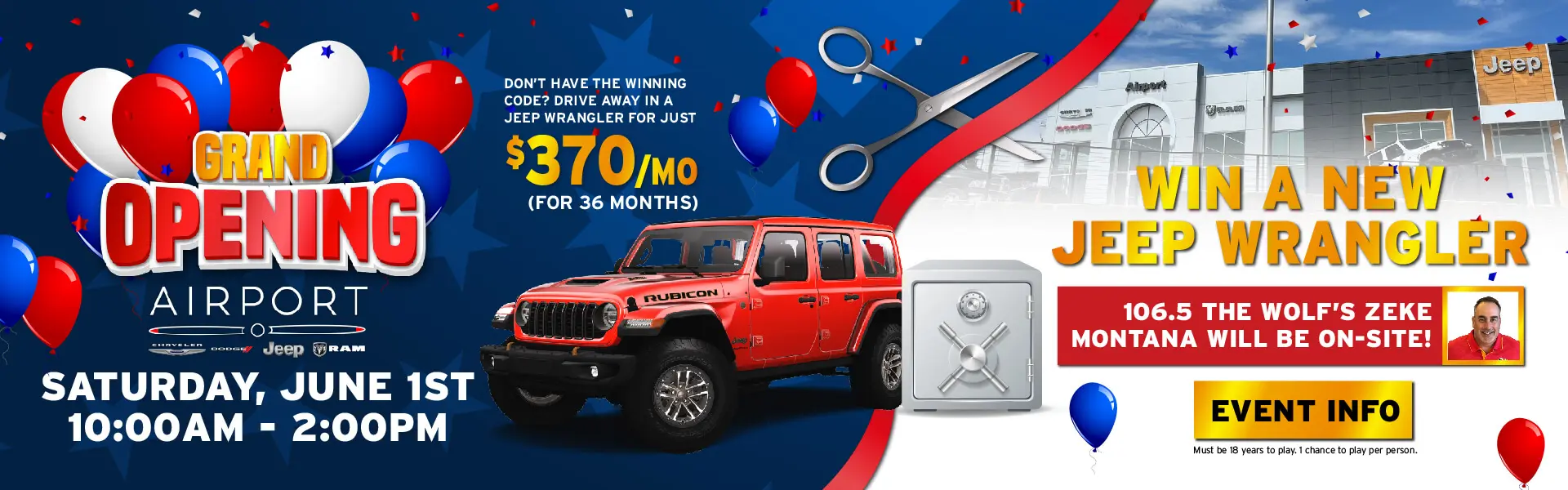At Airport CDJR , we are proud to offer Platte City and the entire Northland community access to a diverse selection of new cars for sale. Whether you are in Liberty in search of a new Jeep or in the Parkville area, we have your needs covered at our store. Now, we want to invite all of our new and old customers to a grand opening celebration. One that will give you the chance to win a new Jeep Wrangler.